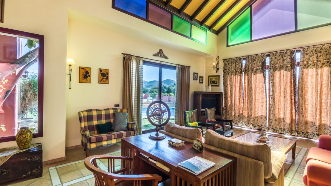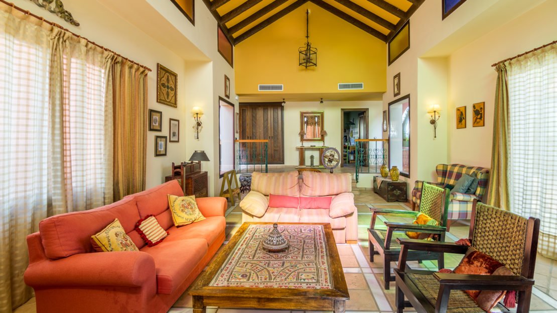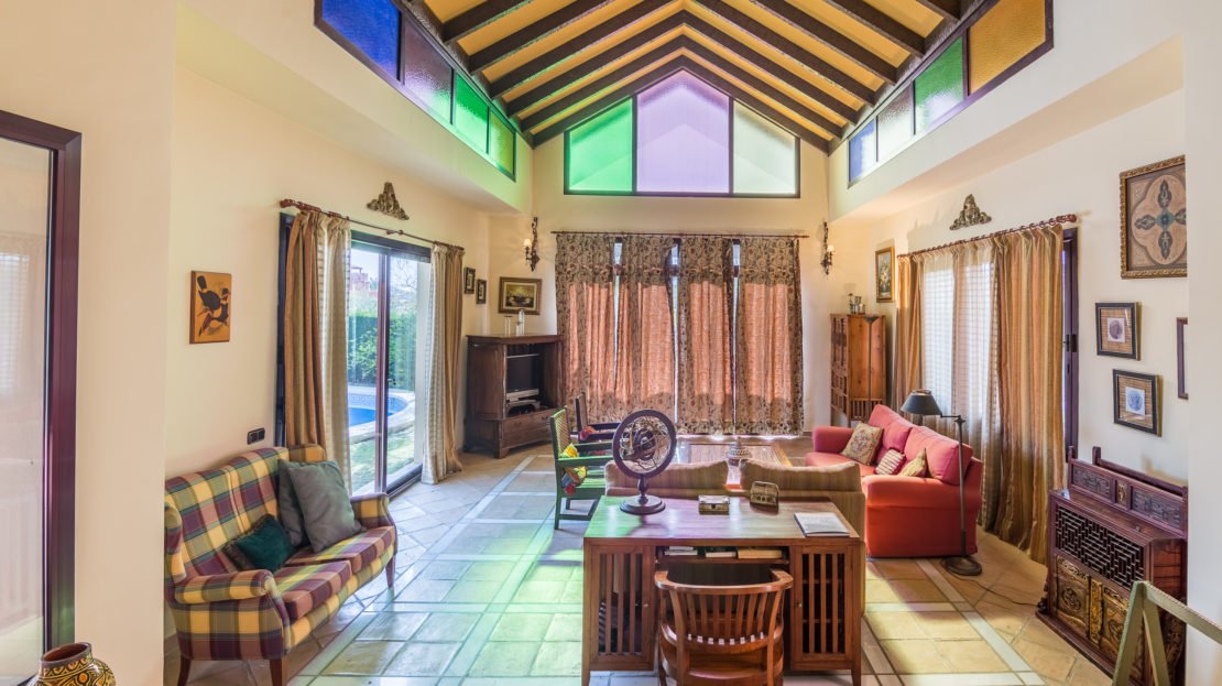 The entrance hall to this villa has high ceilings with beautiful colored glass windows and doors leading to the garden and pool. The bright and spacious living area consists of ample seating and stunning views.